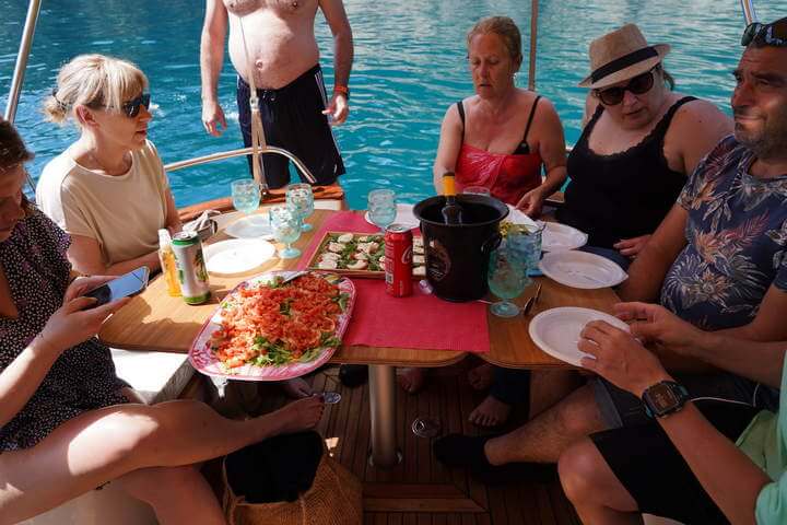 - Pranzo a bordo di fronte a Portovenere: pasta al pesto o ai muscoli, caprese fresca, crostino ligure e salse, con drink illimitati (Prosecco, vino, birra, bibite e limoncino).